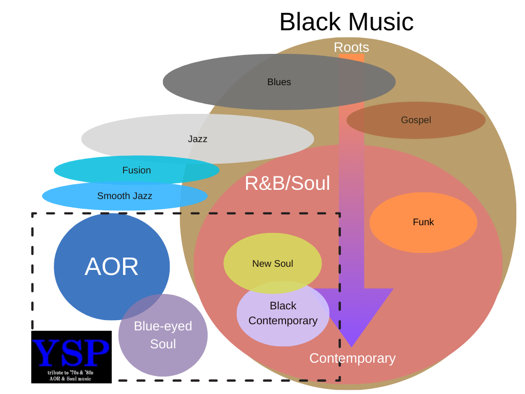 曲調的に、AORとの相性もよく、YSPでは、1980年代の全盛期のブラックミュージック全体(例えばMichael JacksonやPrince等も含め)から選曲しています。