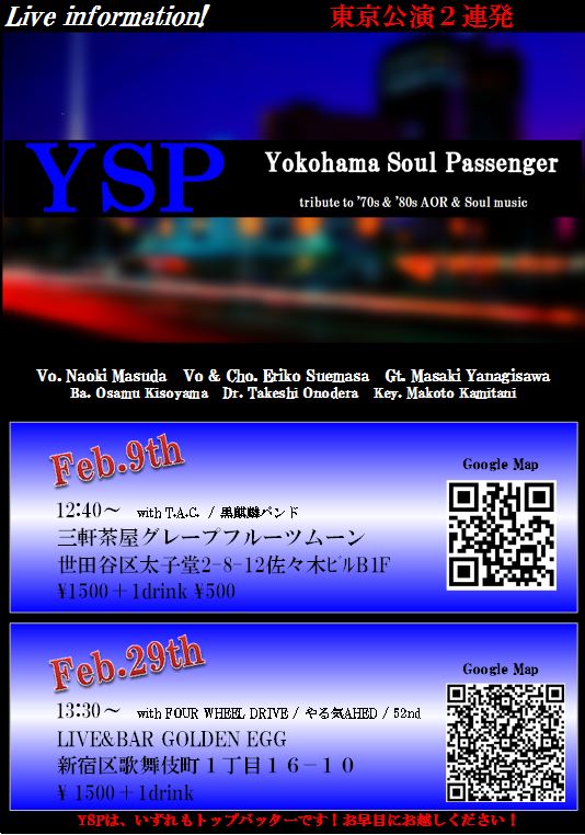 今回は、蒲田の箱で、前回、中止になってしまった、昭和歌謡のベテランバンドのAkasaka Selfish Tokyoさんとの2バンドの対バンになります。言ってみれば、赤坂対横濱です!w