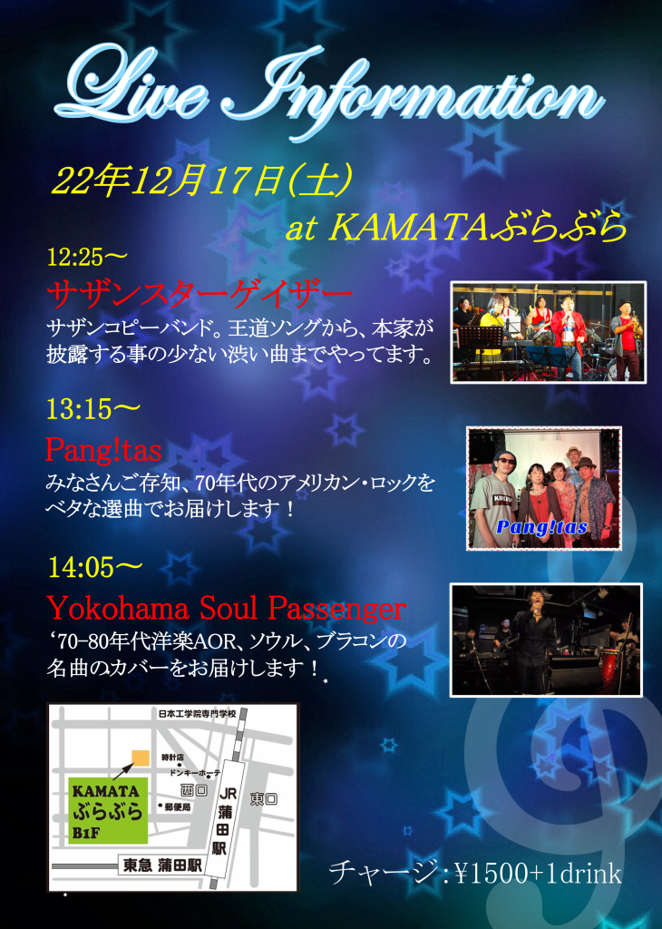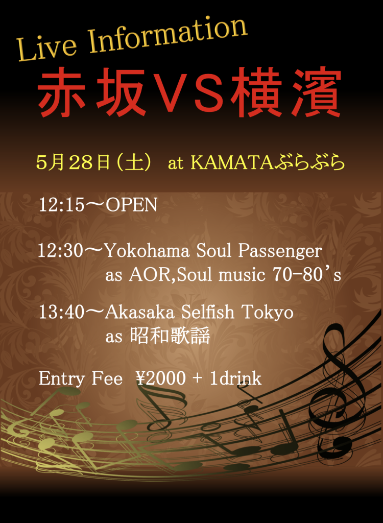 今回は、蒲田の箱で、前回、中止になってしまった、昭和歌謡のベテランバンドのAkasaka Selfish Tokyoさんとの2バンドの対バンになります。言ってみれば、赤坂対横濱です!w